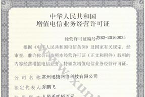 热烈祝贺常州迅捷网络科技有限公司取得由中华人民共和国工业和信息化部印制并颁发的《中华人民共和国增值电信业务经营许可证》,经营许可证编号:苏B2-20160035。